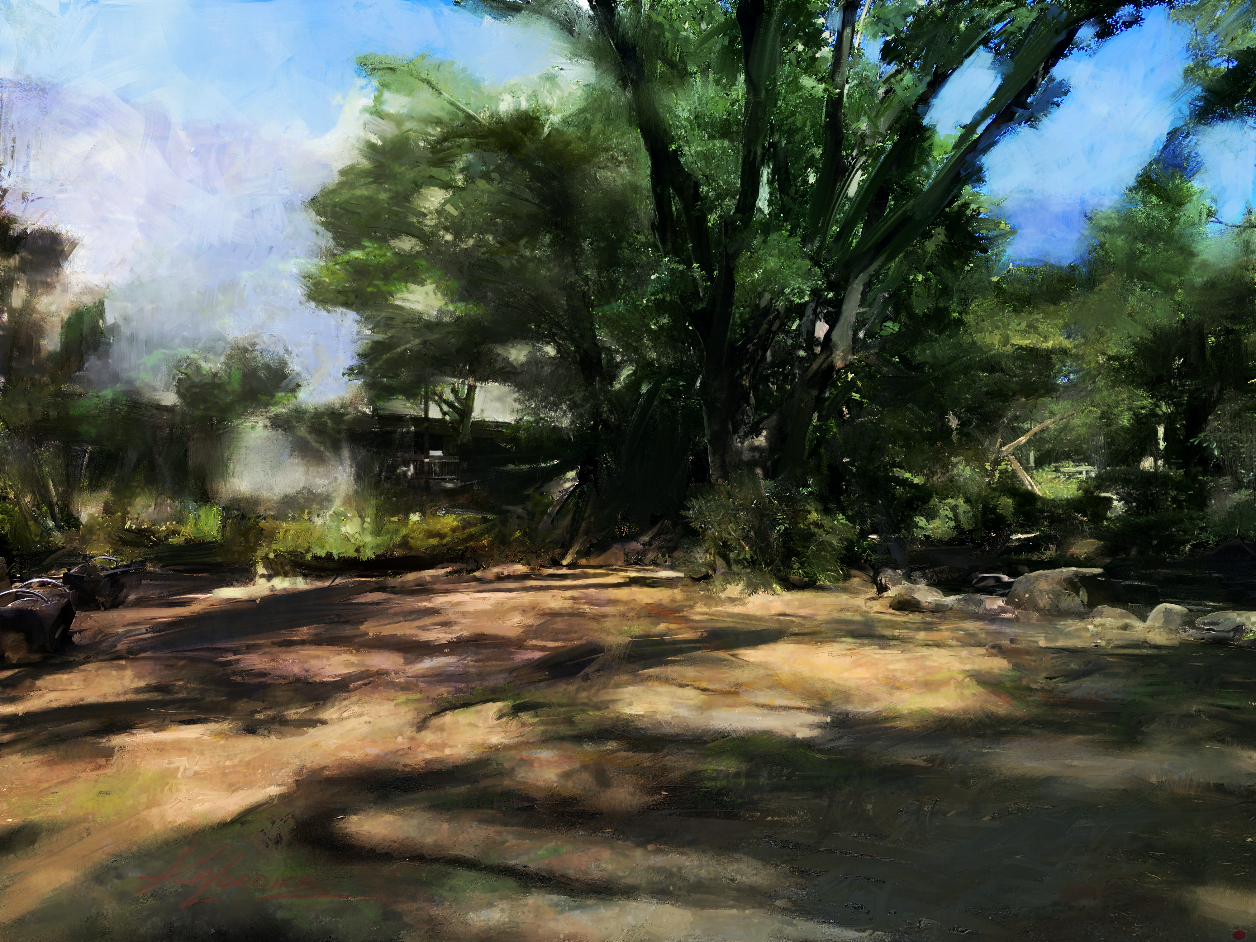 - 基本塗り:最初は簡単な色調で大まかに面を埋め、遠景から近景へ徐々に詳細を詰めていく(Creberも「拡大せずブロックインし、形を固めてから細部を加える」手順を推奨している[10])。